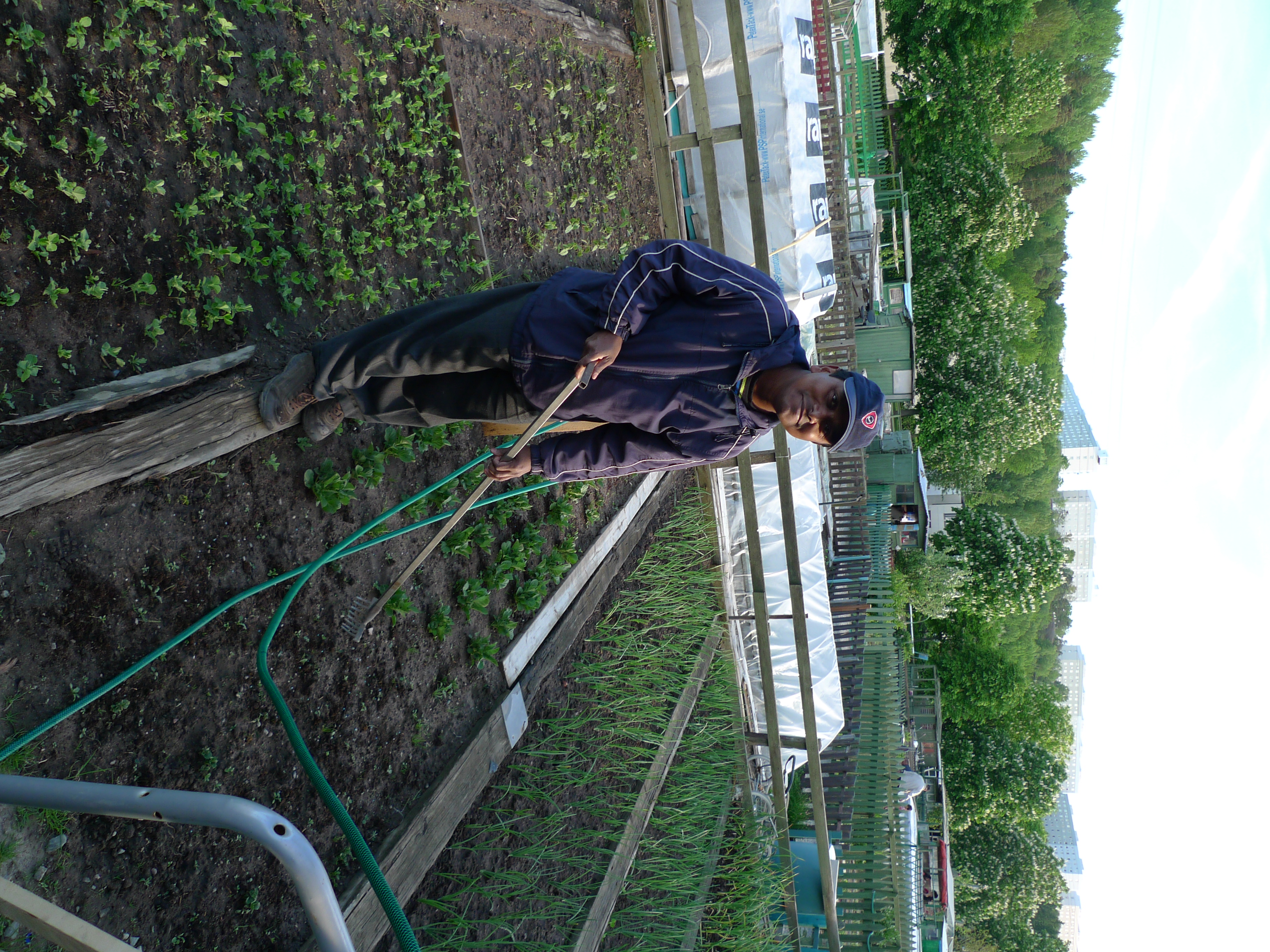 Here is Abul Kalam with his extra-long rake in his plot, which he’s had for about a year. He grows onions, lettuces, radishes, potatoes, beans, and cilantro – which he says his family eats every day. They still cook traditional Burmese food for lunch and dinner, although he says they’ve begun to eat Swedish breakfast now like everybody else – not sticky rice with sweet yam, since sweet yam is one of the foods they can’t get here.